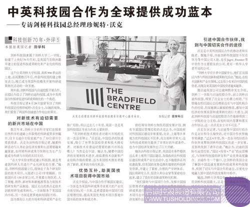 9月4日,科技日報(bào)《科技創(chuàng)新70年》專訪劍橋科技園總經(jīng)理珍妮特·沃克 ,以下為報(bào)道全文: