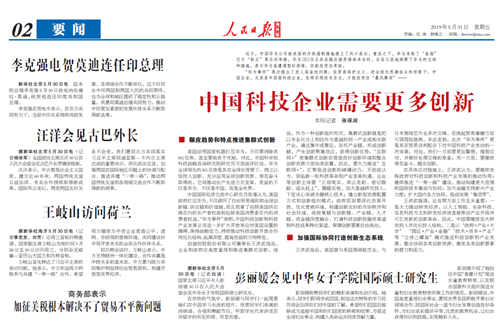 近日,王濟(jì)武董事長(zhǎng)就“華為事件”接受人民日?qǐng)?bào)記者專訪?!度嗣袢?qǐng)?bào)海外版》于今日在要聞版以《中國(guó)科技企業(yè)需要更多創(chuàng)新》為題進(jìn)行了相關(guān)報(bào)道。內(nèi)容如下:
