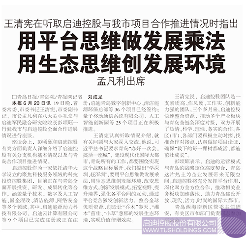 青島日報6月21日頭版報道: 19日晚,省委常委、市委書記王清憲,市委副書記、市長孟凡利在八大關(guān)小禮堂與啟迪三螺旋研究院院長彭頃砡一行就我市與啟迪控股全面合作進(jìn)展情況進(jìn)行座談。