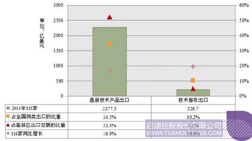國家高新區(qū)積極鼓勵(lì)企業(yè)開拓和利用國際市場,通過重點(diǎn)發(fā)展高附加值的高新技術(shù)產(chǎn)品和技術(shù)服務(wù)出口,優(yōu)化和升級出口貿(mào)易結(jié)構(gòu),在激烈的國際競爭市場占有一席之地。2014年國家高新區(qū)企業(yè)高新技術(shù)產(chǎn)品出口總額達(dá)2,277.5億美元,占全國高新技術(shù)產(chǎn)品出口比重的34.5%,同比增長16.9%。企業(yè)實(shí)現(xiàn)技術(shù)服務(wù)出口總額226.7億美元,占全國服務(wù)出口比重達(dá)10.2%,同比增長達(dá)19.6%。