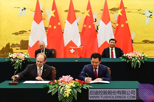 2016年4月,中國國家主席習(xí)近平與瑞士國家主席施耐德·阿曼共同見證啟迪控股董事長王濟(jì)武(前排右)與瑞士國家創(chuàng)新園簽署合作協(xié)議